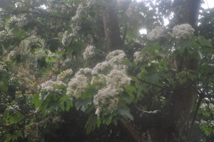 ,斜坡上的油桐樹林值得欣賞,平時用來挑鳳梨,下雨則有排水的功能。上了山坡看到滿地的桐花,多麼詩情畫意,又沒眾人的喧嚷,寧靜又安祥這才是真正享受桐趣的地方。